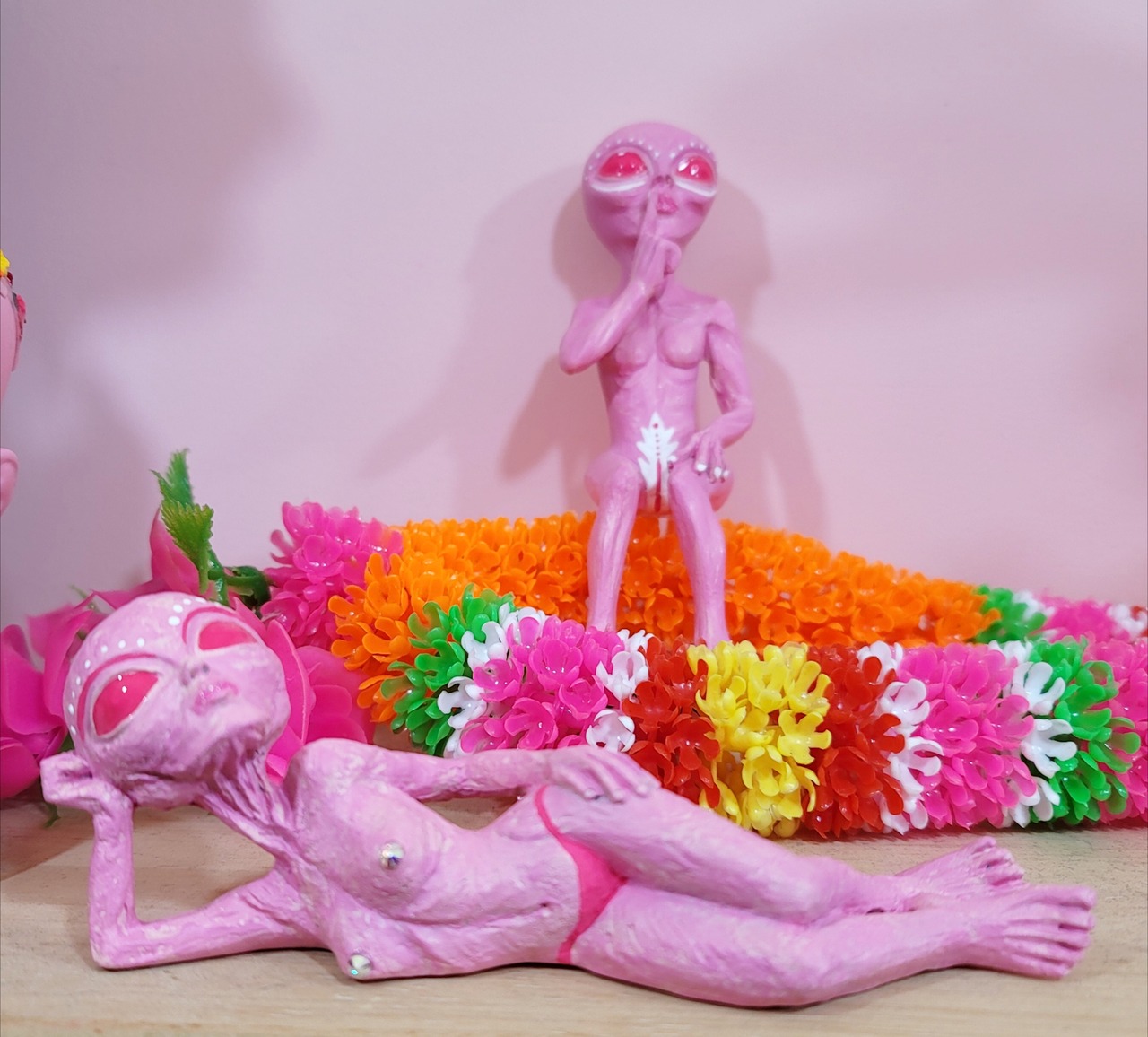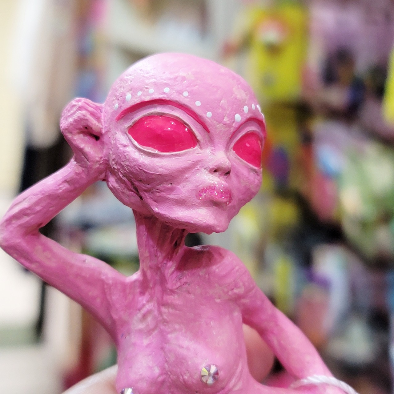ご機嫌なピンクなエイリアン 乳首がキラキラスワロフスキー 陶器にハンドペイントしてます おめめとクチビルはとぅるんとぅるん サイズ約14~15cm